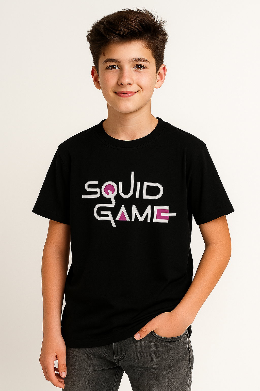Step into the game with this premium Black Squid Game Graphic Tee, crafted from high-quality sublimation cotton for that buttery-soft comfort and long-lasting print vibrancy. The sleek black-and-pink Squid Game logo pops perfectly against the crisp white base, making it a must-have for every K-drama and pop culture fan.