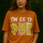 This oversized orange tee features the legendary Tweety Bird in full cartoon chaos mode — bringing vintage Looney Tunes energy to the Gen Z streetwear scene. It’s loud, playful, and just the right amount of nostalgic 🐥🧡