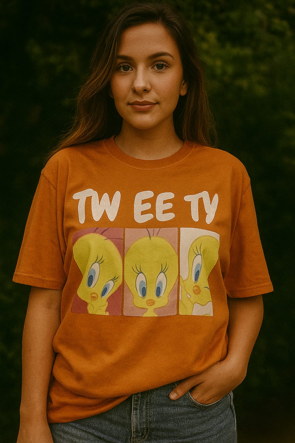 This oversized orange tee features the legendary Tweety Bird in full cartoon chaos mode — bringing vintage Looney Tunes energy to the Gen Z streetwear scene. It’s loud, playful, and just the right amount of nostalgic 🐥🧡